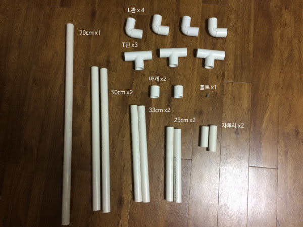 준비물 : PVC 파이프 약 3M + L관 4개 + T관 3개 + 마개 2개 + 볼트 1개