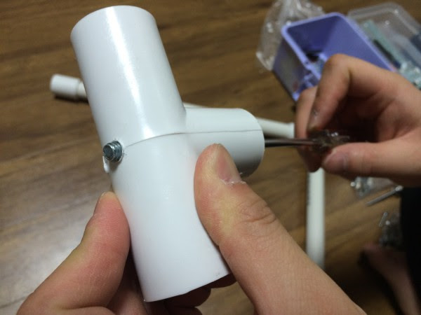 T관의 중앙에 볼트가 들어갈 구멍을 뚫어주세요. 전 마침 드릴피스가 떨어진 관계로 수작업으로.