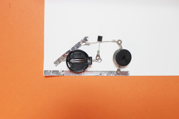 카드의 안쪽면에 알루미늄 테이프 두장을 붙입니다. 전류가 흐를 수 있도록 하는 역할이예요. 왼쪽 귀퉁이를 접어 스위치처럼 사용할거예요.