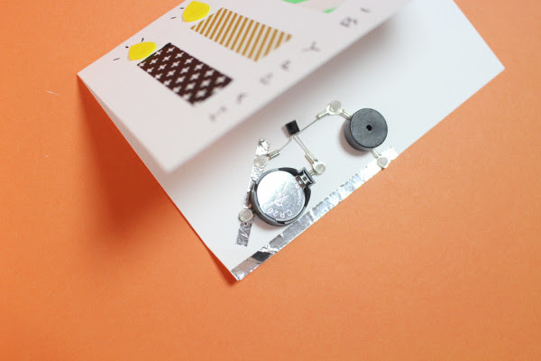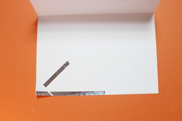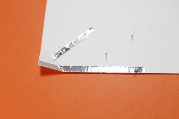카드의 안쪽면에 알루미늄 테이프 두장을 붙입니다. 전류가 흐를 수 있도록 하는 역할이예요. 왼쪽 귀퉁이를 접어 스위치처럼 사용할거예요.