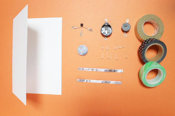 준비물 : 카드종이, 멜로디IC, 전지홀더와 3V전지, 고정핀5세트, 알루미늄테입, 무늬테이프