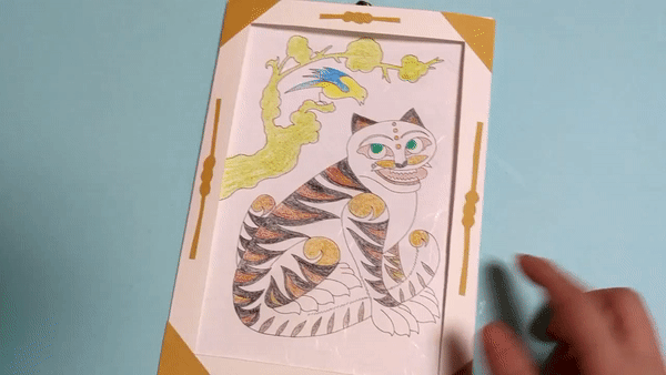 민화도안을 색칠하고 종이로 액자를 만들어 넣어주었어요.