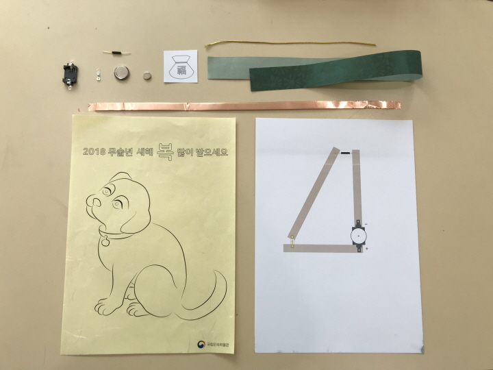 종이에 구리테이프와 LED, 전지, 리드스위치를 붙여 회로를 만듭니다.