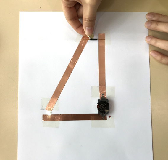 종이에 구리테이프와 LED, 전지, 리드스위치를 붙여 회로를 만듭니다.