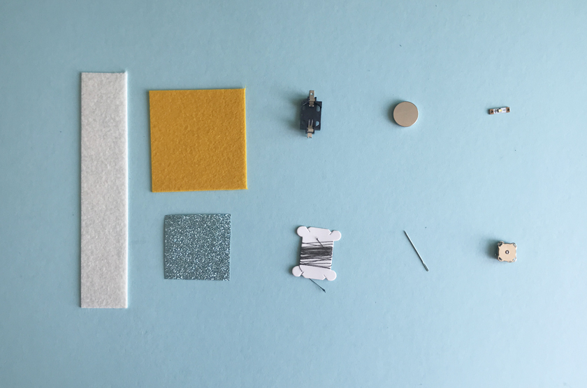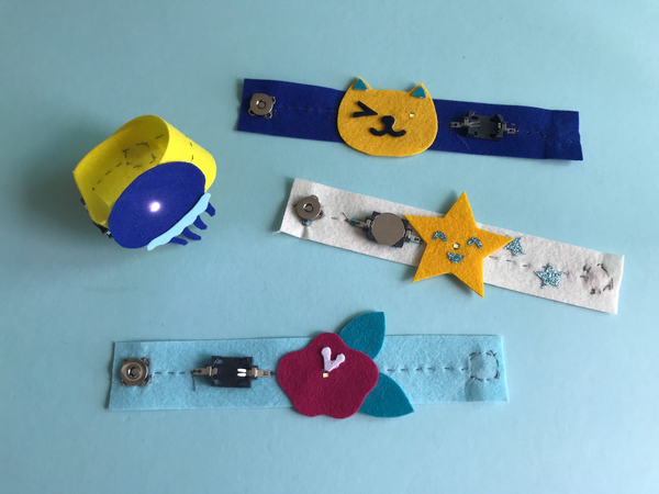 전기가 통하는 실을 전도성 실이라고 하는데요. 이 실로 LED와 전지를 천에 바느질하면 전기가 흐르는 웨어러블 전자회로를 만들 수 있어요. LED 팔찌 만들기 키트는 웨어러블 전자회로를 만드는 기초를 익힐 수 있도록 최소한의 부품을 이용해 전자회로를 구성하도록 만들었어요.