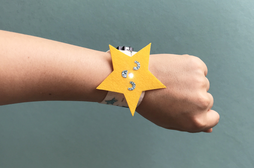 팔목에 착용해 보았습니다. 펠트지를 오려 다양한 모양을 만드세요.