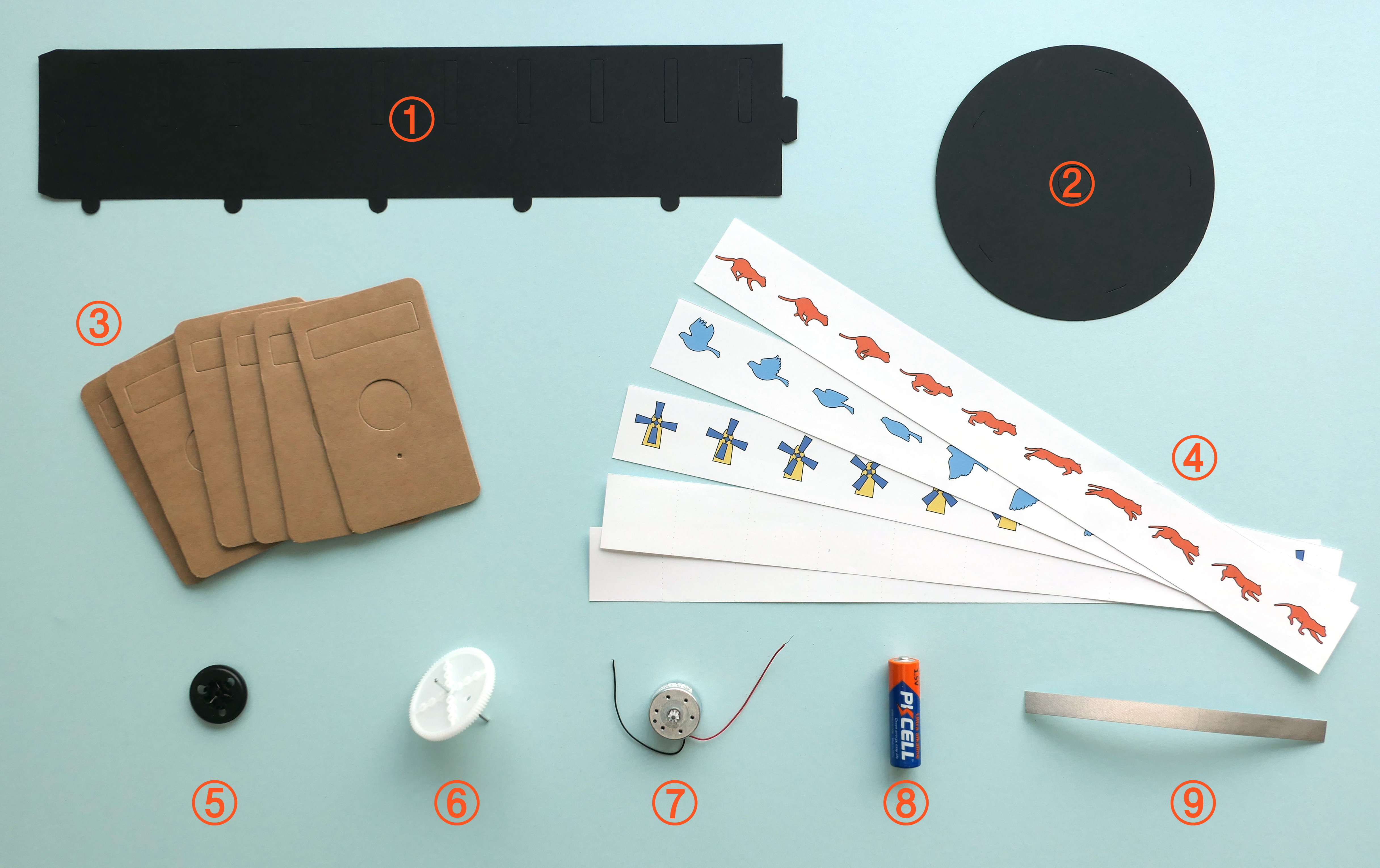구성품 ① 슬릿 전개도 ② 원판 ③ 골판지 6장 ④ 연속 그림들 ⑤ 홀더 캡 ⑥ 톱니바퀴와 축 ⑦ 모터 ⑧ AA전지 ⑨ 전도성 테이프