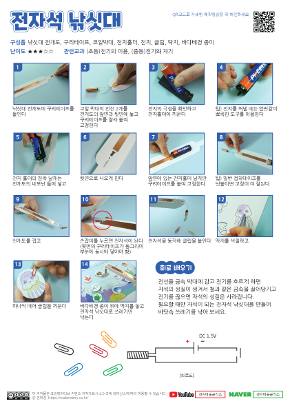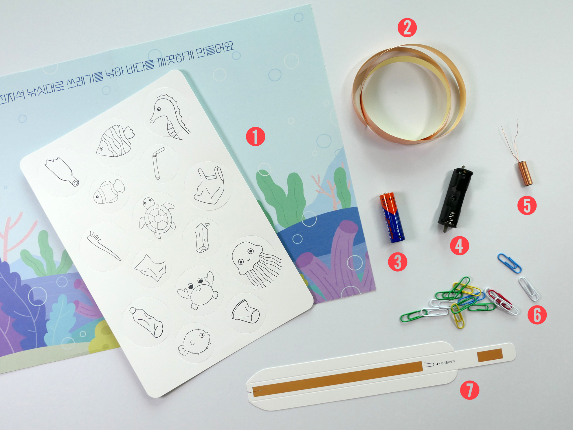 ① 바다배경 종이와 딱지 ②구리 테이프 ③전지 ④전지 홀더 ⑤코일 막대 ⑥클립 ⑦낚싯대 전개도