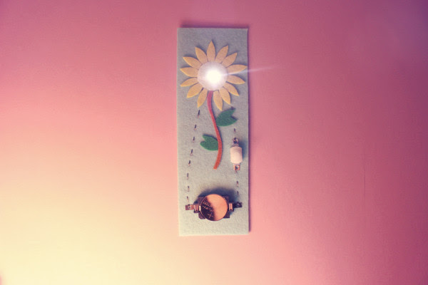 따뜻한 느낌의 펠트지위에 전도성 실로 한땀 한땀 바느질해서 LED가 반짝이는 책갈피를 만듭니다.
