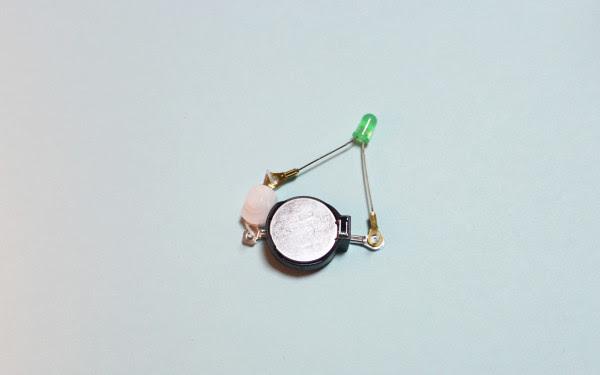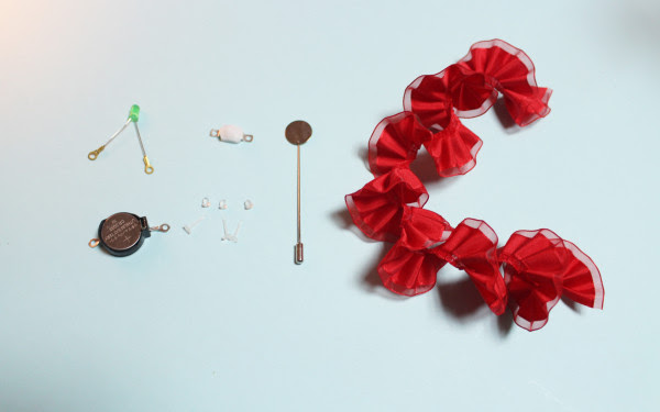 준비물 : LED, 전지홀더, 전지, 스위치, 고정캡과 고정핀, 부토니에핀, 리본